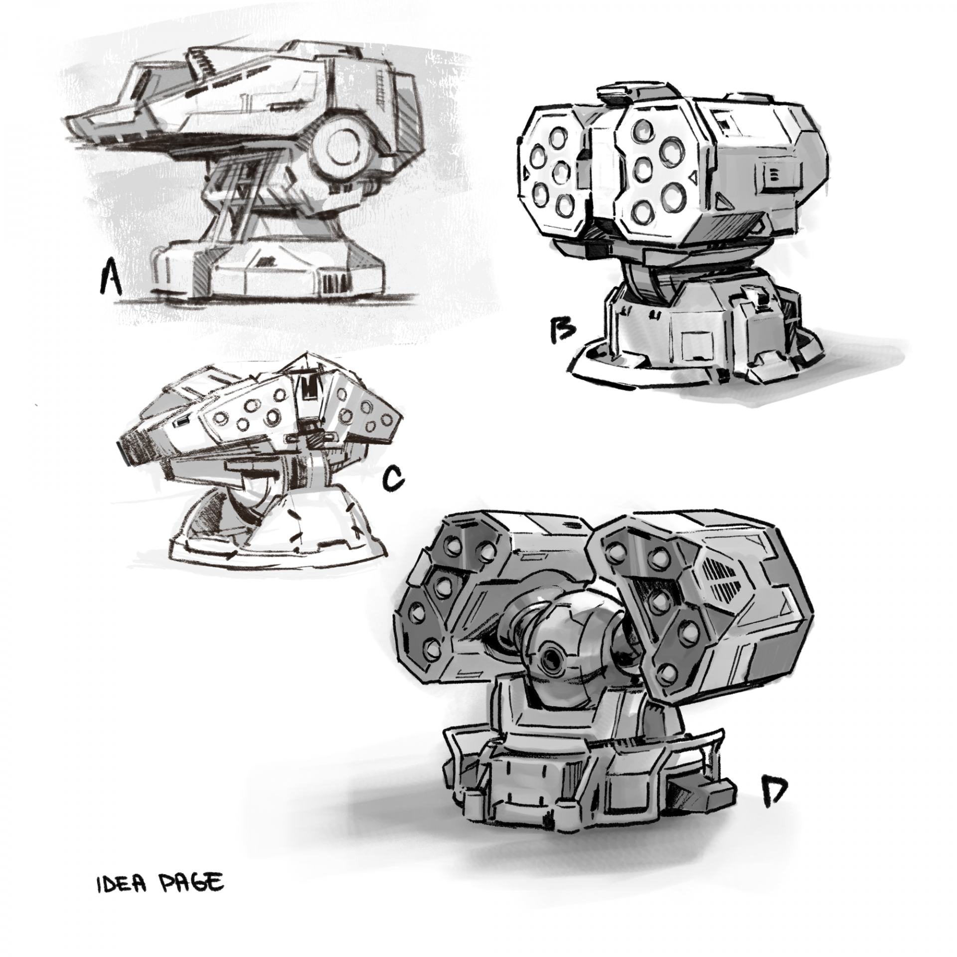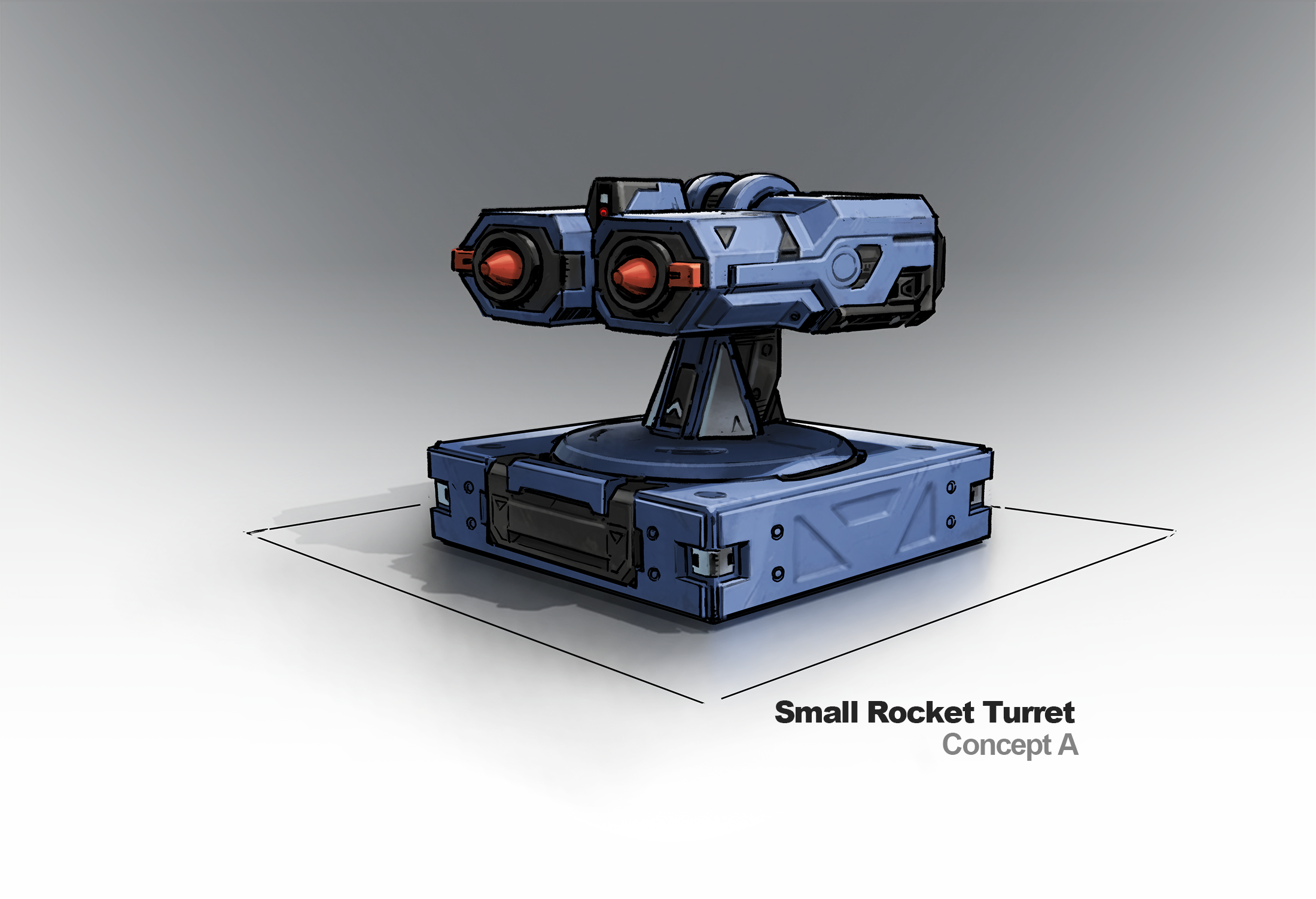 What really struck me with the small rocket turret is the idea of having that turret as an inset device. Idle, it would appear to be a standard armor block, but when armed the sides withdraw and the turret is revealed and is functional. Reload of the empty turret would occur after it returns to the idle state inside the cube. Then it would pop open again and reveal itself for more havoc.